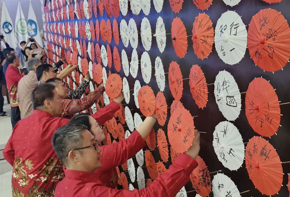 Sebanyak 3.024 payung kertas berdiameter 20 sentimeter disusun menjadi tampilan visual megah di dua sisi dinding aula. Setiap payung dihiasi kaligrafi Mandarin dengan berbagai pesan, mulai dari “You Jiao Wulei” yang berarti pendidikan tanpa perbedaan, hingga ungkapan “I Love Indonesia”.